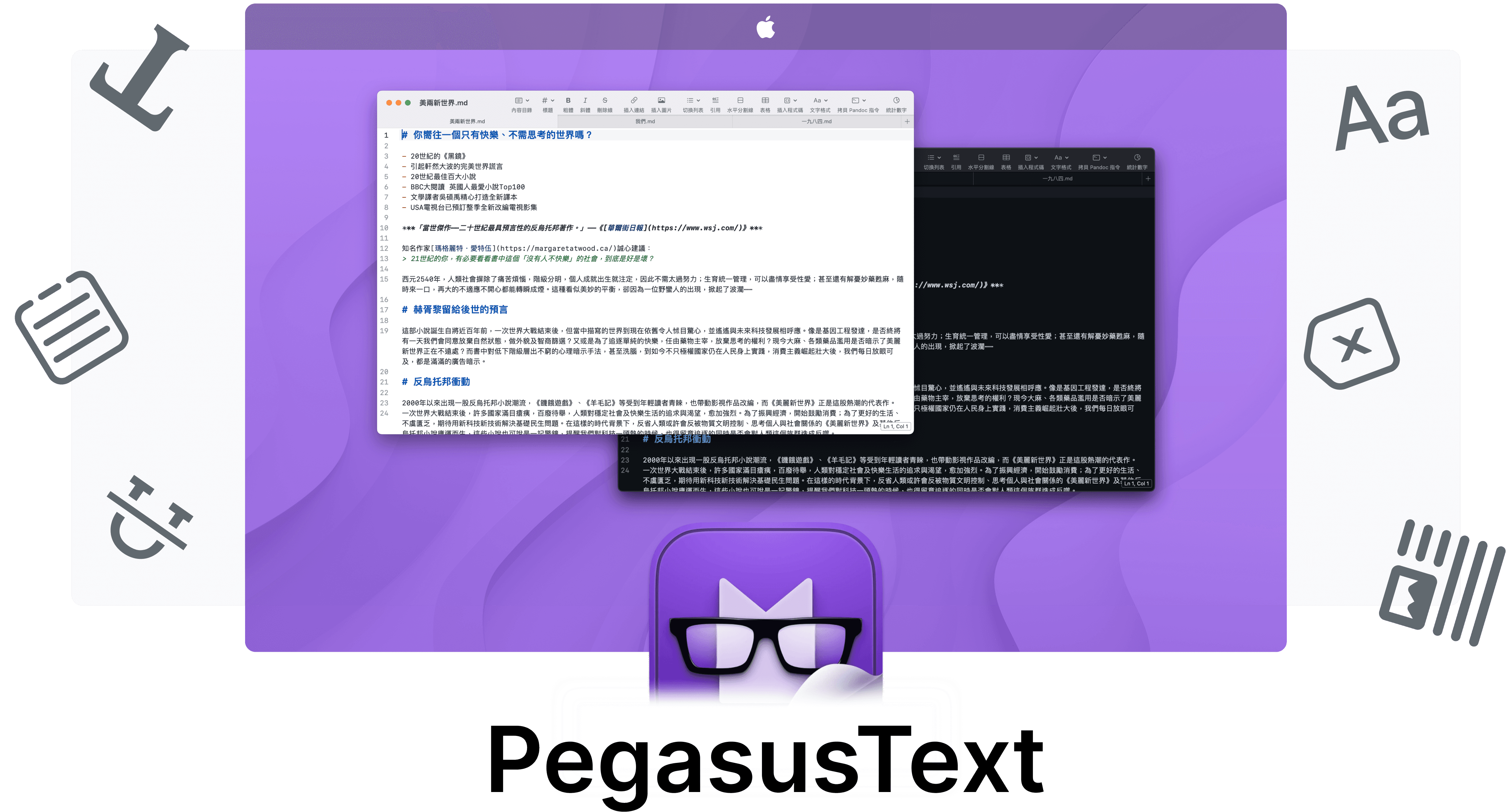 PegasusText 是專為那些仍然喜歡美觀的 macOS 應用程式的用戶而設計的。作為一個高效的基於文檔的應用程式,它提供了許多令人驚嘆的功能。我們完全遵循 macOS 的設計互動風格,包括 UI 元件和快速鍵等。所有本地功能都保留,例如按壓快速查詢單詞或詞組、用力長按鏈接即可查看網頁的內文預覽、使用 Option-Esc 完成單詞串字,以及在輸入時檢查拼寫。值得一提的是,如果您使用 macOS Sonoma 以上版本, PegasusText 還提供了預測文字功能。